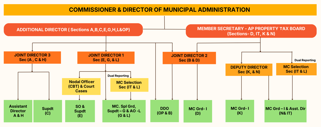 | 5 | G | • Land alienations, acquisitions • Municipal Building repairs • Urban Housing & APTIDCO • Disaster Management • LIGH Quarters & IDSMT scheme • All Town Planning, Engineering & Education matters | 1. Sri P. Chandra Mouliswarreddy, MC Selection 2. Sri G. Ramana Reddy, Special Grade 3. Kum P. Himaja, Superintendent | 1. Kishore Babu, Junior Account Officer (OD) 2. D. Yeswanth Sai, Junior Assistant (OD) | 1. P. Gnandev, WAS 2. L. Venkatesh, WAS 3. V. Sravan Srinivas Kumar, WAS (P) 4. Y. Venkateswara Rao, WAS (P) |